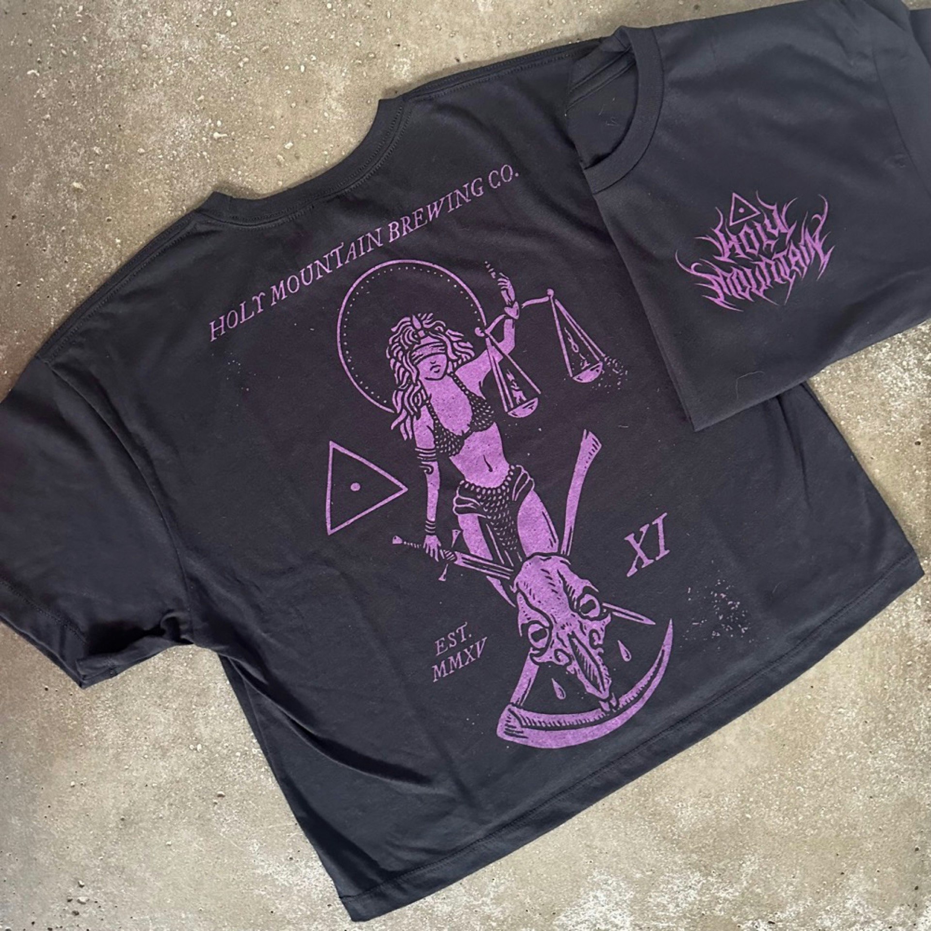 Black Next Level crop tee with our 11th Anniversary IPA logo on the back and our Holy Mountain metal logo on the front left breast. both prints are purple.