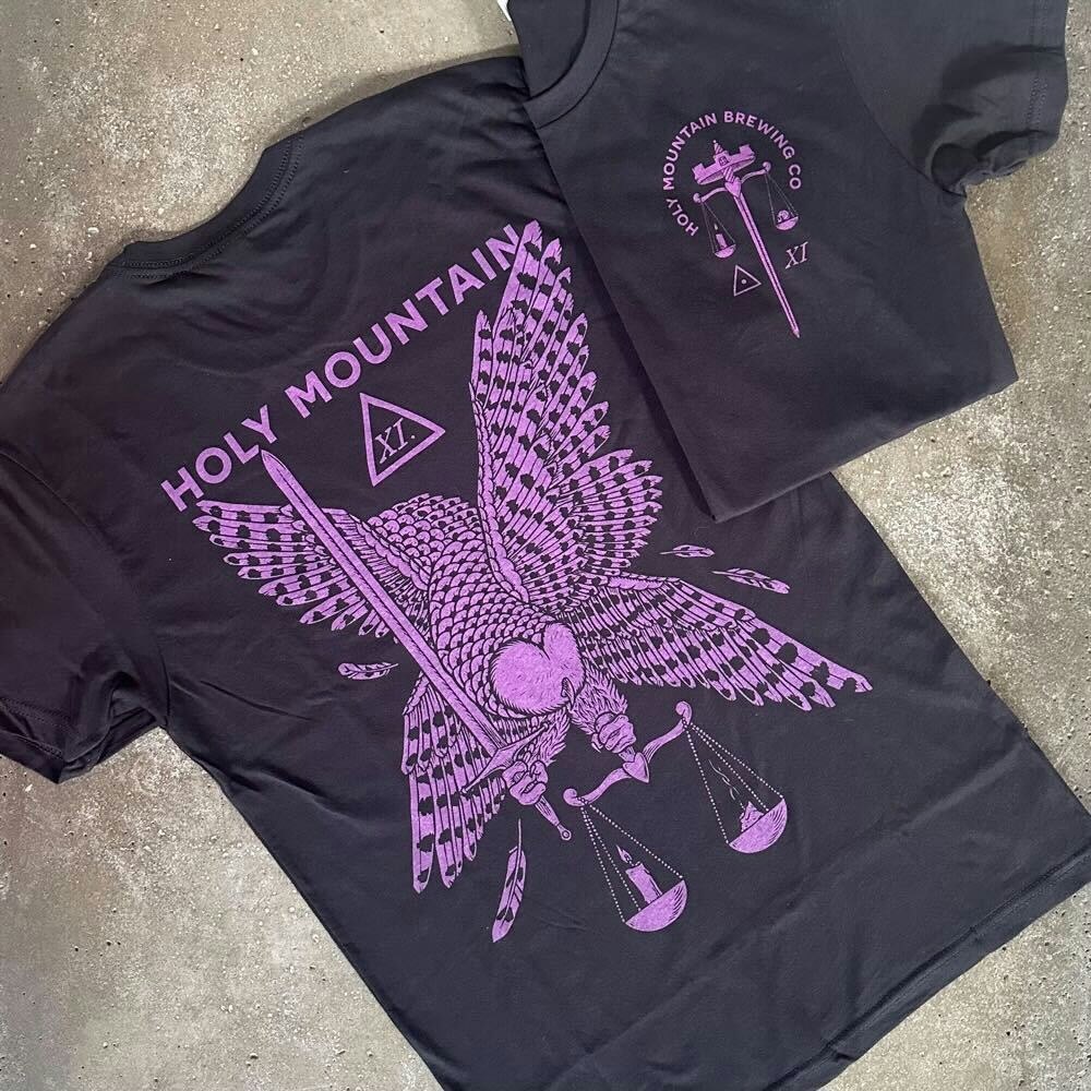 Black Next Level tee with our 11th Anniversary purple bottle design on the back and our anniversary pilsner design on the front left breast.