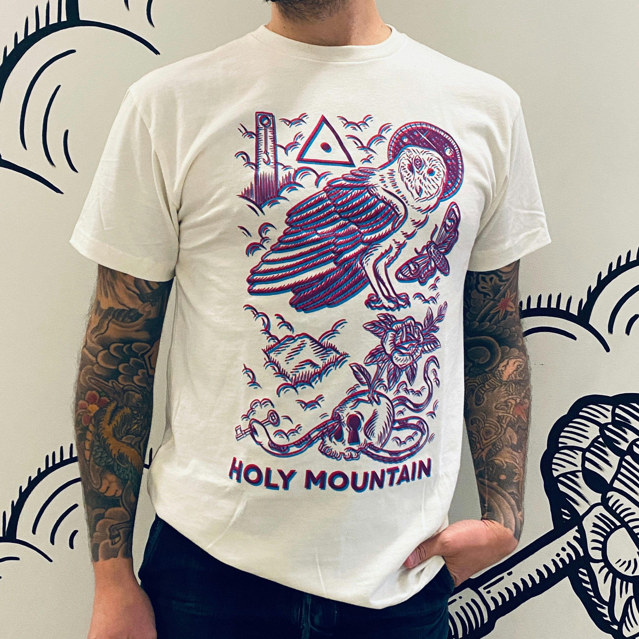 Multi-color “3D” print on natural eco-heavyweight tee from Next Level.