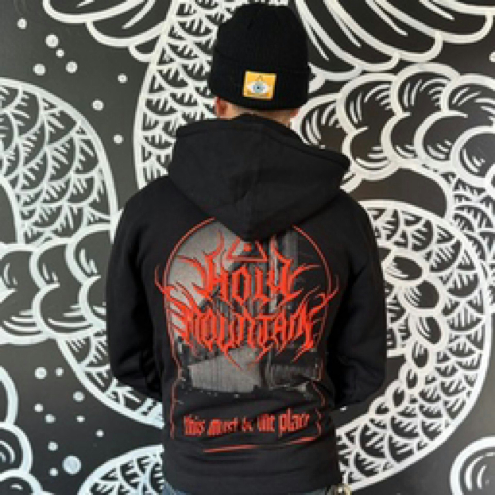 Super soft red and white print on a black heavyweight pullover hoodie from Independent featuring our train artwork on the back, and our “metal” logo on the front left breast.