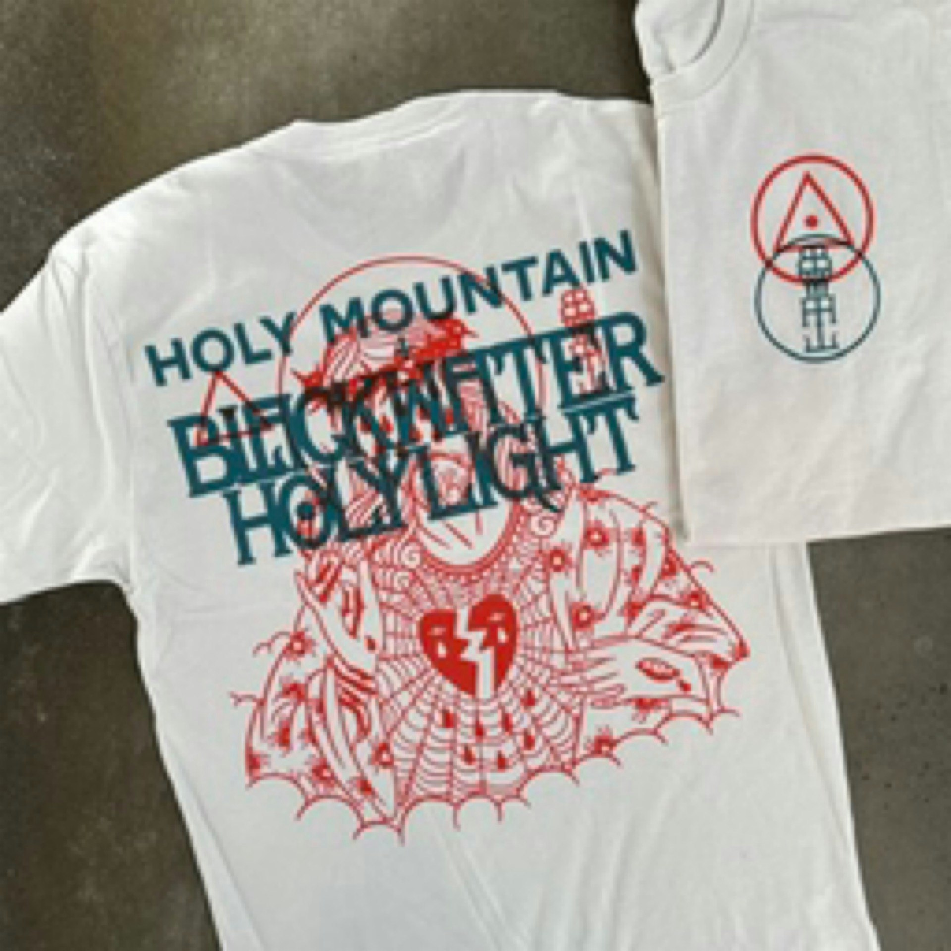 Multicolor print on off white/grey next level tee featuring the artwork from our 10th anniversary lager cans on the back. BWHL and our logos on the front. Black Water Holy Light collabed with us on the lager & headlined our anniversary show!