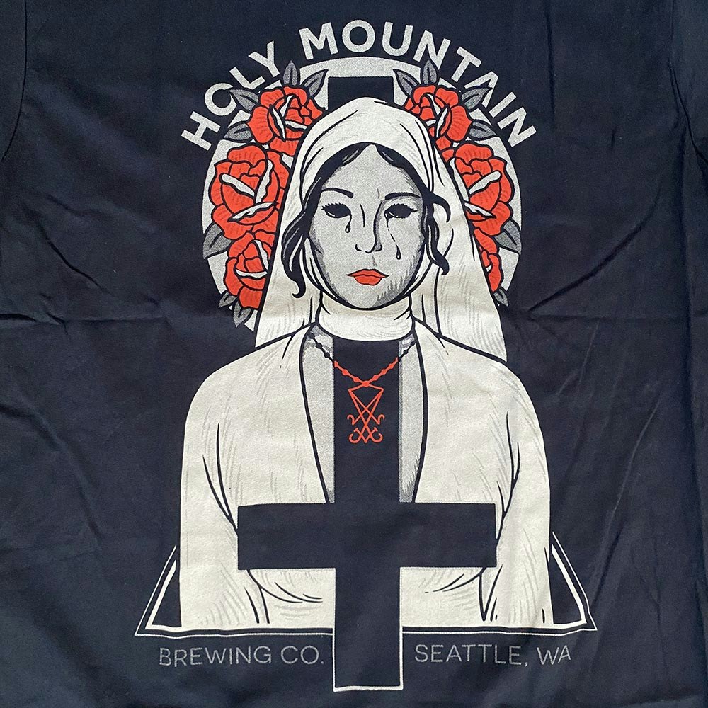 Super soft discharge print on a solid black next level tee featuring the artwork from our Crucifixation IPA.