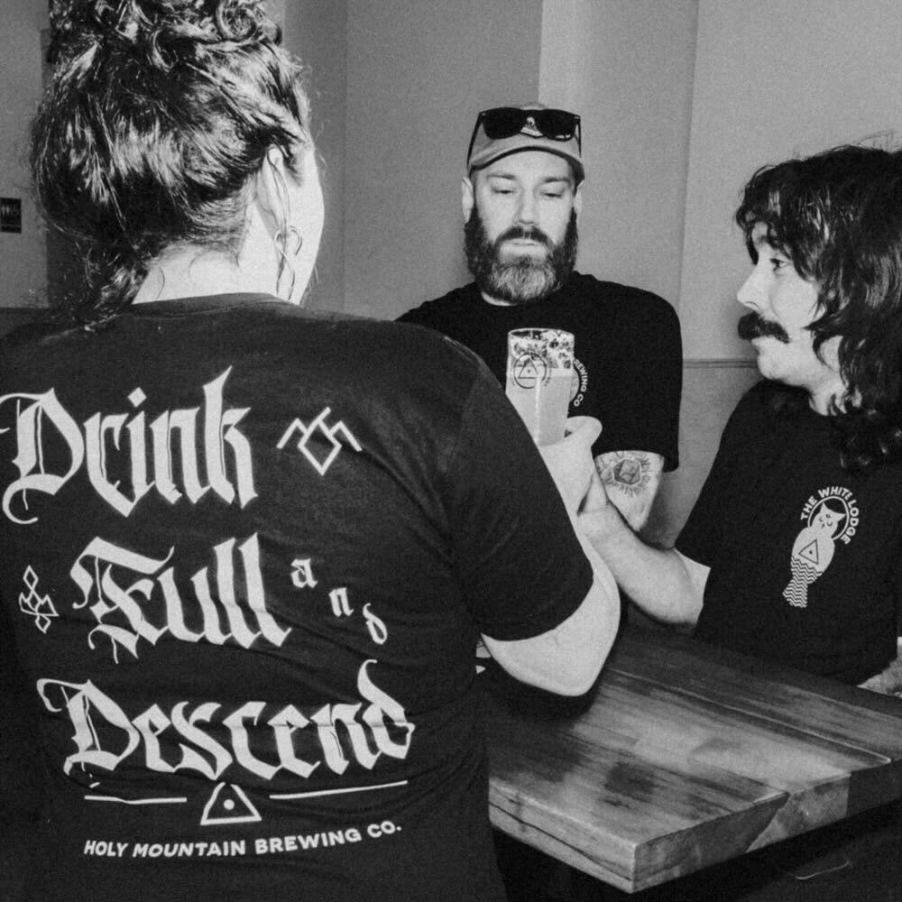 Black Next Level tee with our new White Lodge/Twin Peaks themed owl on the front left breast in white. On the back is white print in gothic lettering that says “Drink Full and Descend” with a couple of Twin Peaks symbols.