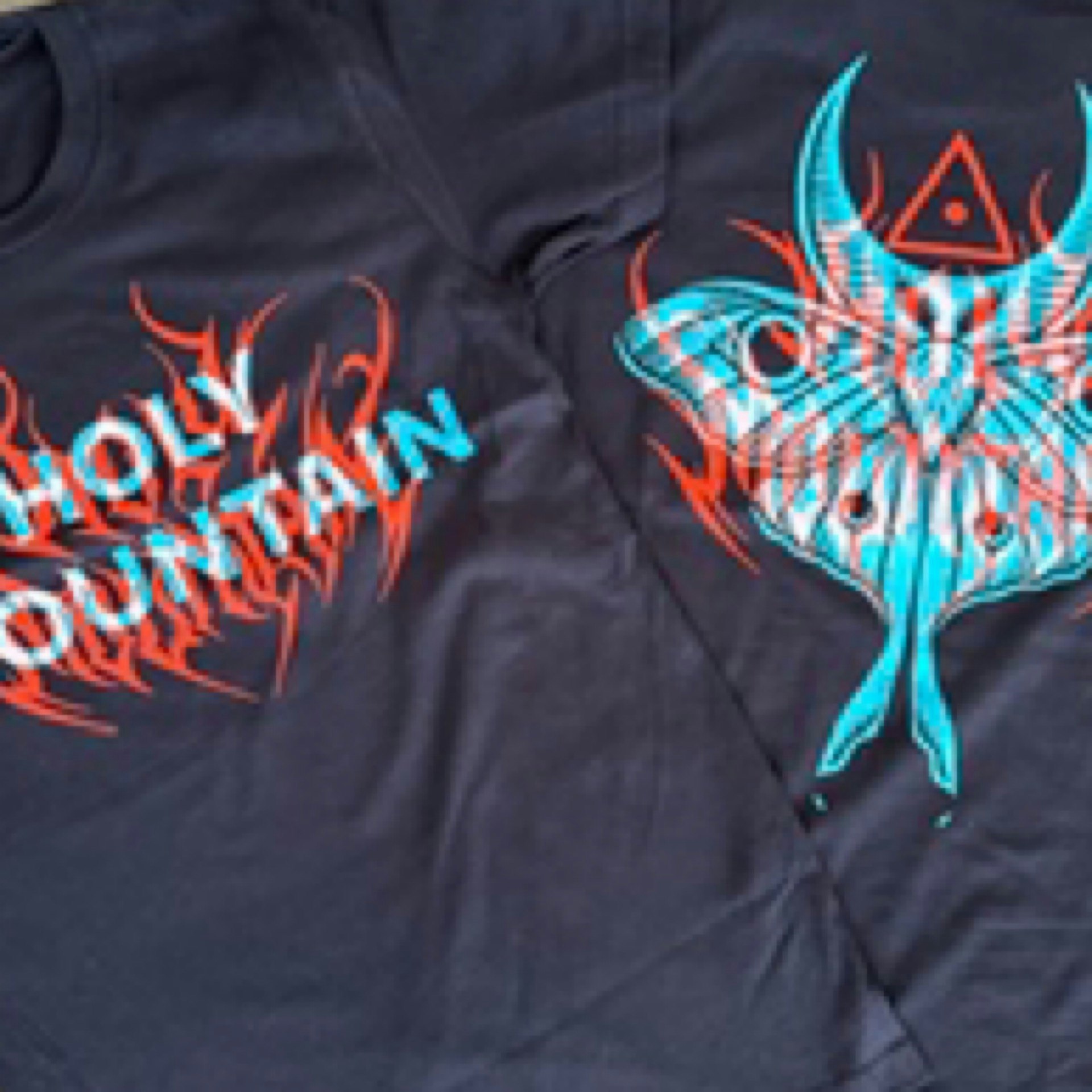 Black Next Level tee with bright red, teal and cream colored print. The front print is our “metal logo” and HOLY MOUNTAIN and the back is printed with our “metal logo” and a large teal moth.