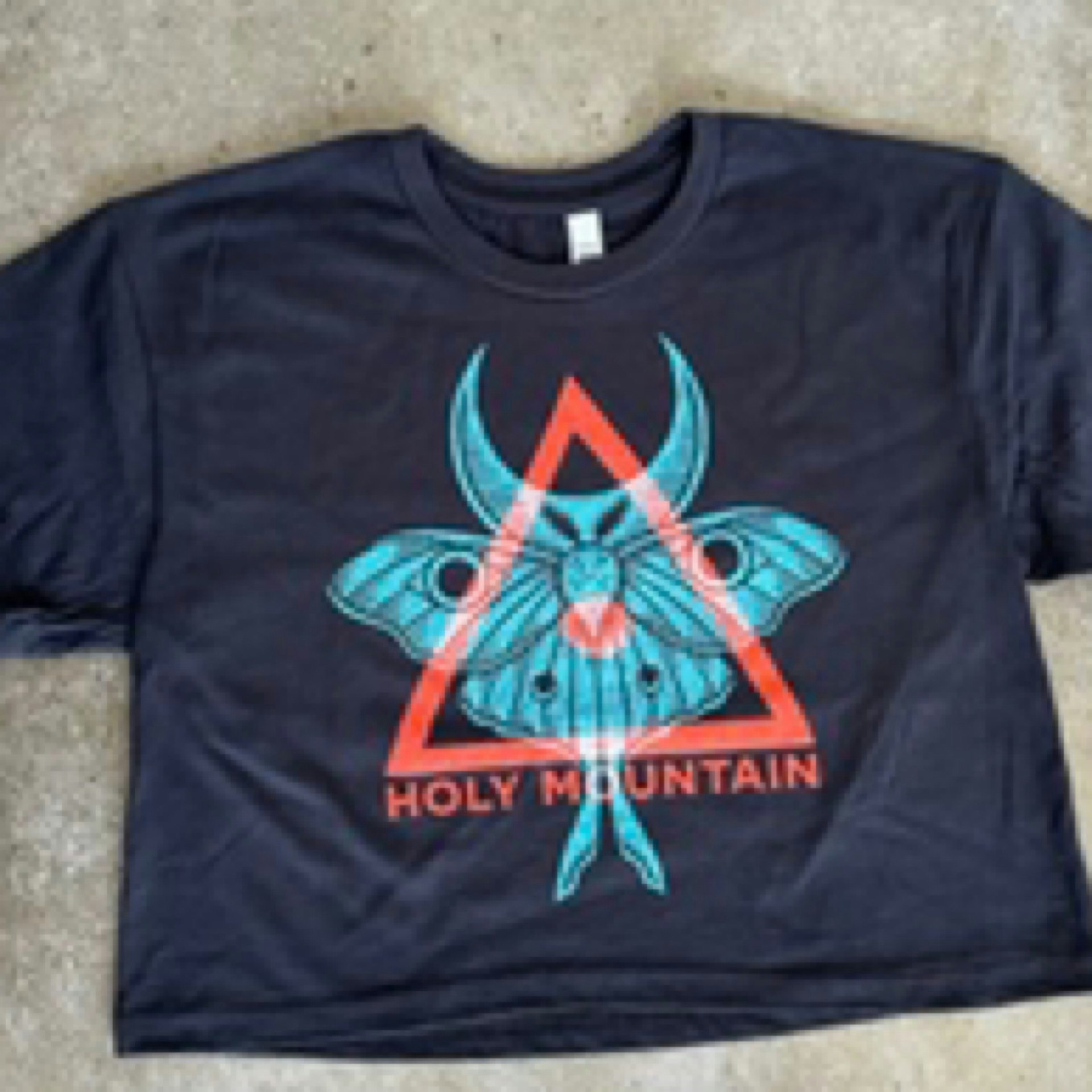 Black IDEAL crop tee with a front print of our logo in red in the background and a “translucent” teal moth printed on top of it.