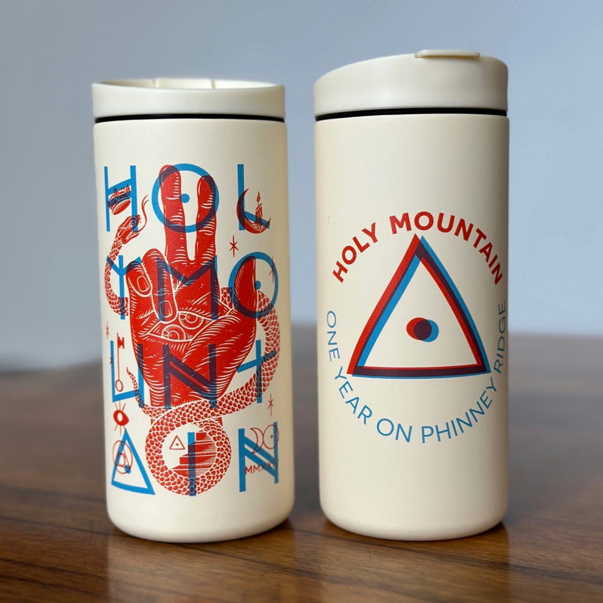12oz traveler mug from Miir featuring a Blue and bright red screenprint of our Hand of Midnight artwork on one side and our logo with “One Year on Phinney Ridge” on the other side.