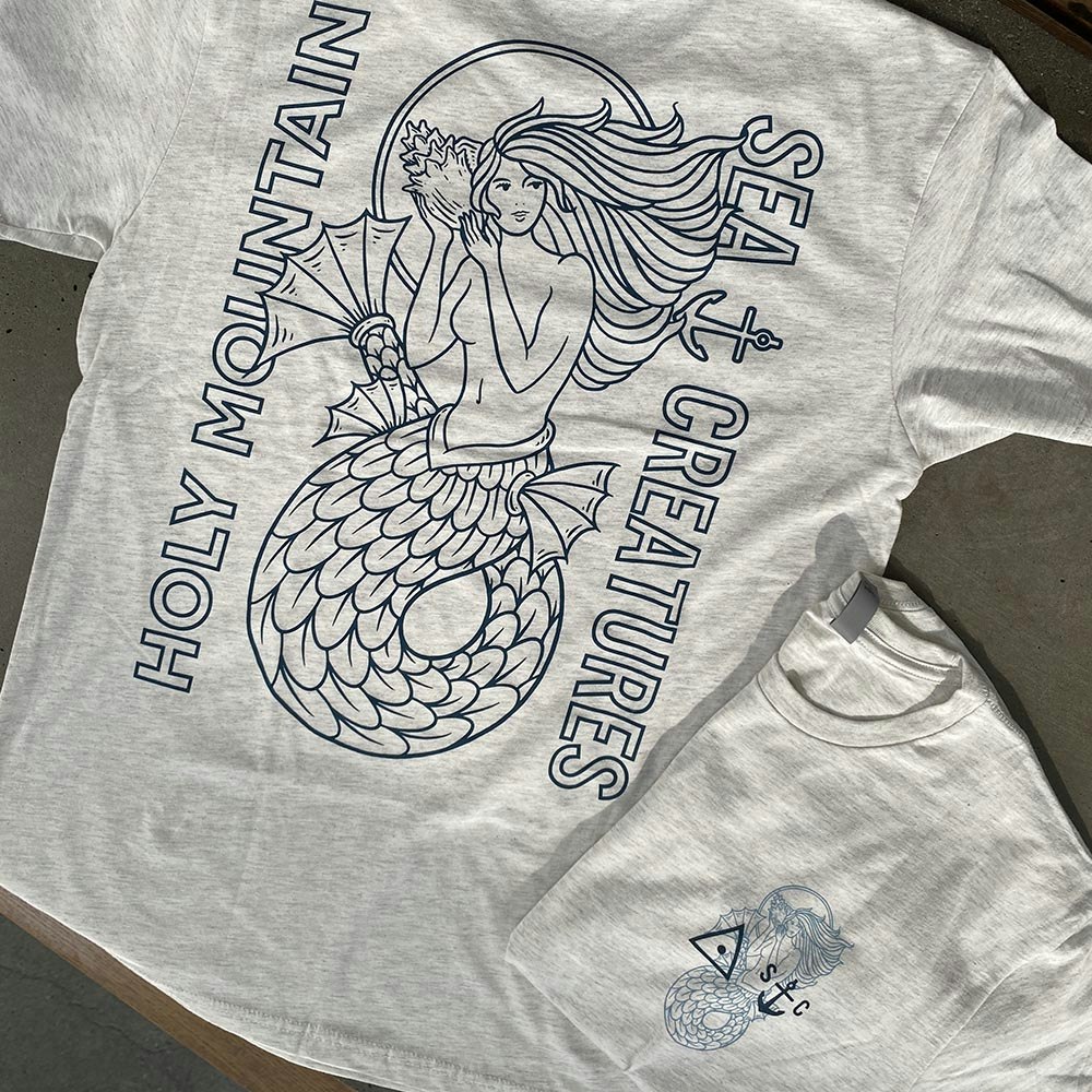 Two colors of nautical blue printed on oatmeal heather tees from Next Level featuring the artwork from our Dortmunder Lager collab with Sea Creatures – Song of the Sea.