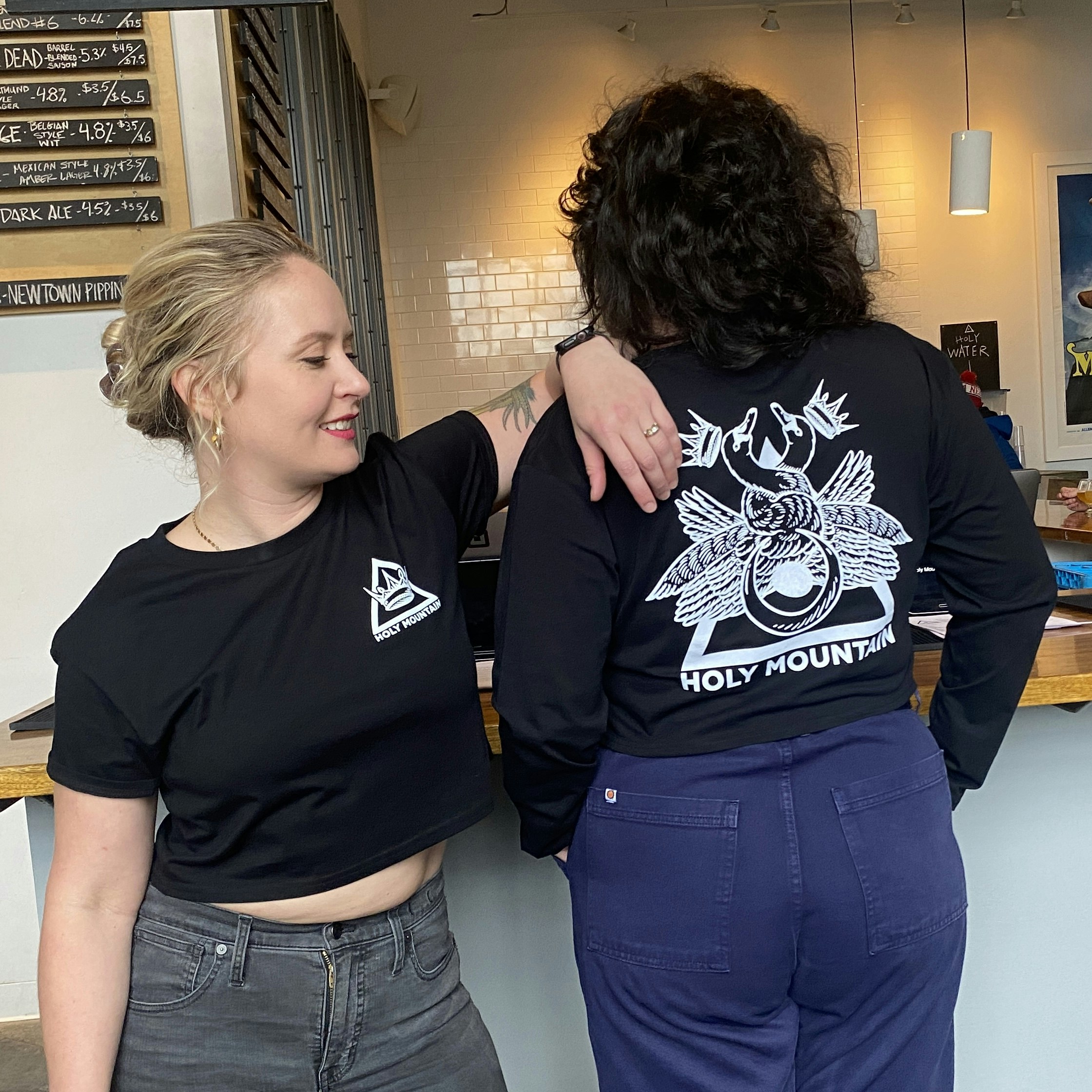 Bright white print on Long Sleeve ASColour crop top tee featuring the artwork from a beer we once made called SWAN.
