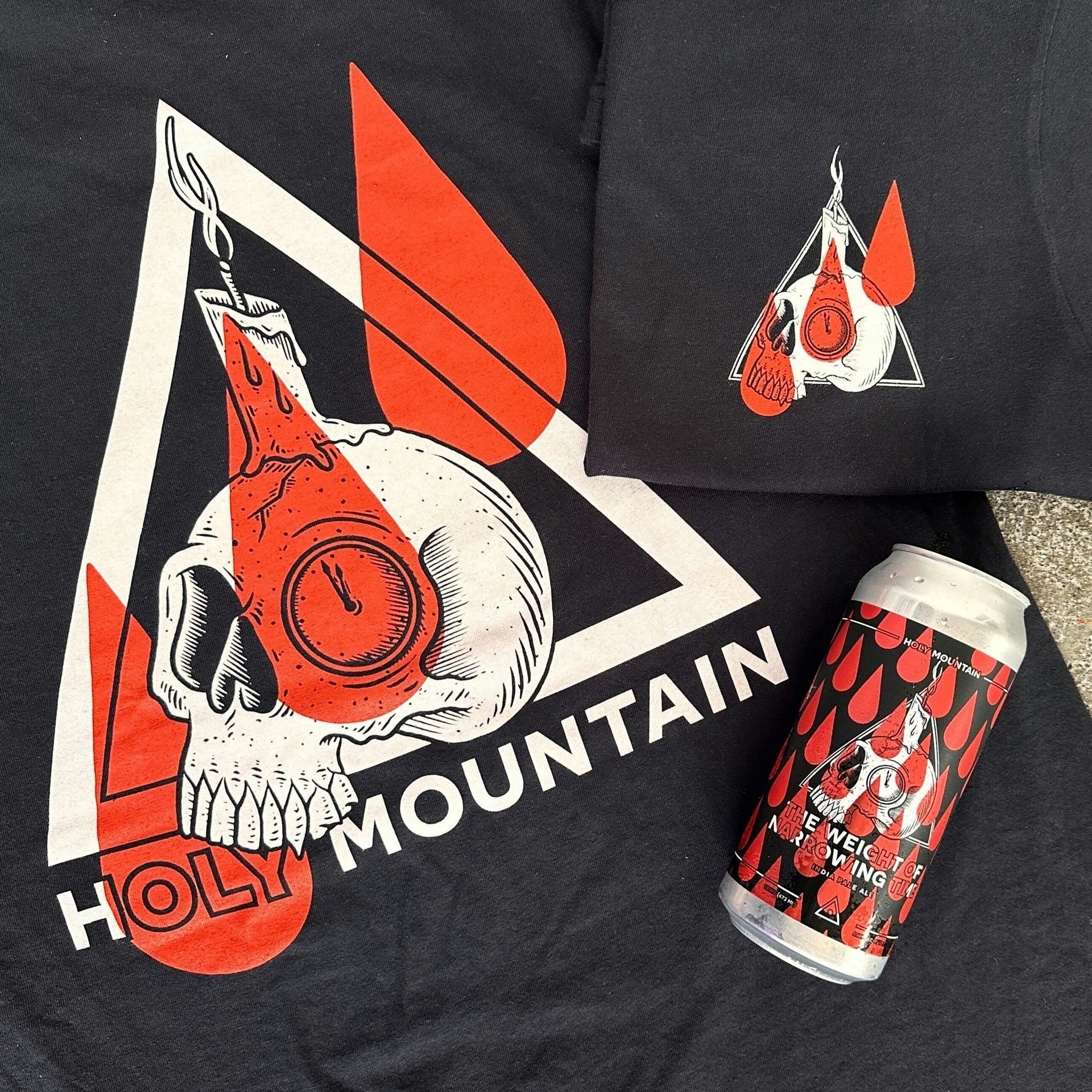 Soft print on black Comfort Colors tees featuring the red and white artwork for out Weight of Narrowing Time IPA cans on the back and the same artwork but smaller on the left breast on the front.