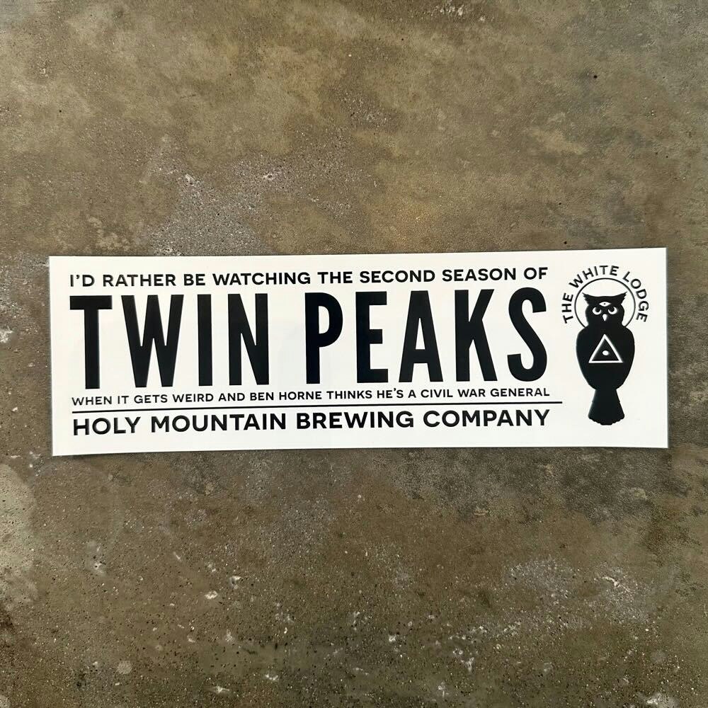 8 1/2 x 2 3/4 inch white bumper sticker that reads “I’d rather be watching the second season of Twin Peaks when it gets weird and Ben Horne thinks he’s a civil war general. Holy Mountain Brewing Company.” there is an own with a third eye and our logo in its center with a ring over the top of it on the far right of the sticker and above it reads “The White Lodge” – after our flagship wheat beer.