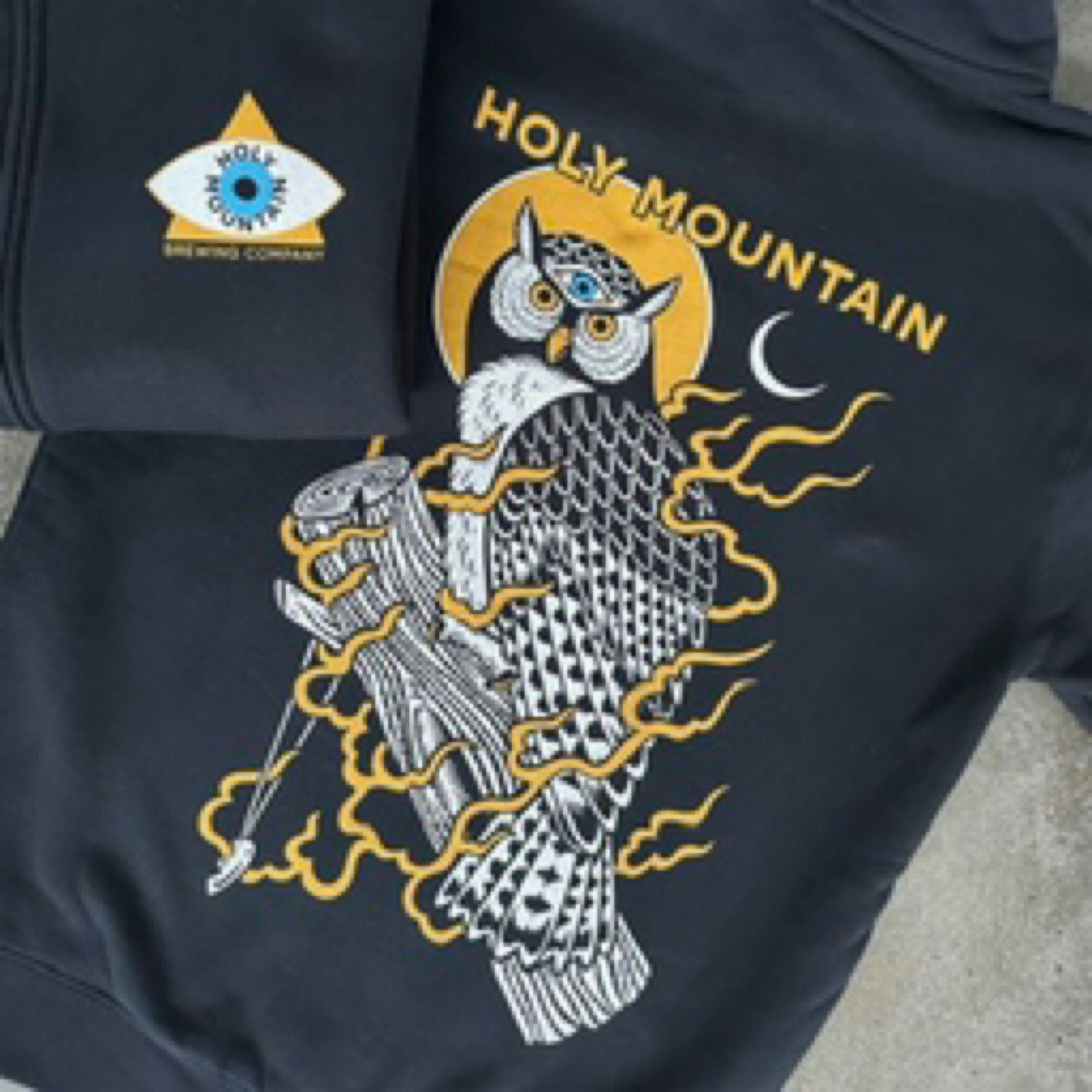 This super soft black Independent zip-up hoodie has the artwork for our White Lodge cans in white grey and yellow on the back and a small blue and white eye over a yellow square with our logo on the front left breast.